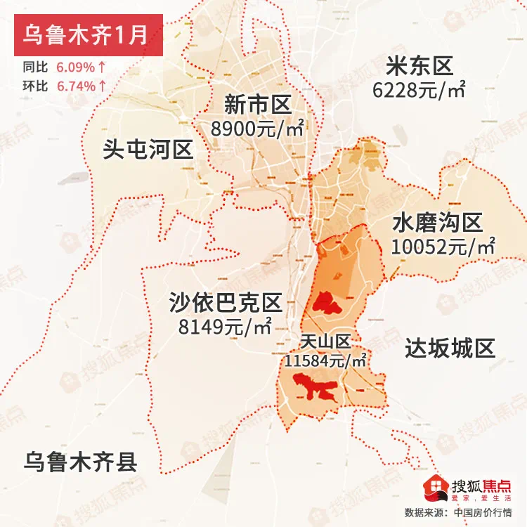 乌鲁木齐1月均价为9207元/㎡同比上涨6.09%↑,环比上涨6.74%↑
