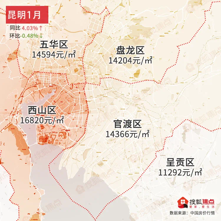 昆明1月均价为14325元/㎡同比上涨4.03%↑,环比下跌-0.48%↓