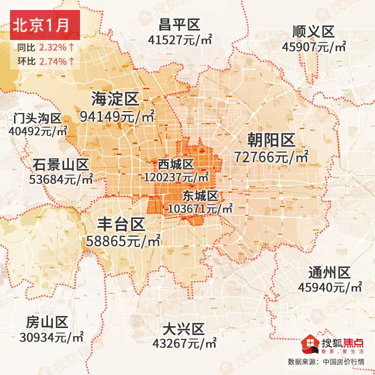 北京1月均价为66493元/㎡同比上涨2.32%↑,环比上涨2.74%↑