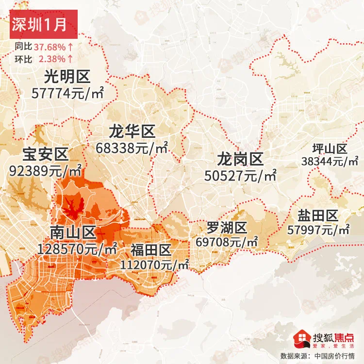 深圳1月均价为90049元/㎡同比上涨37.68%↑,环比上涨2.38%↑