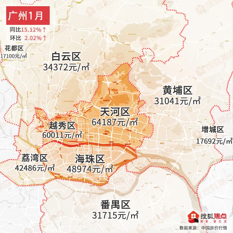 广州1月均价为40657元/㎡同比上涨15.12%↑,环比上涨2.02%↑