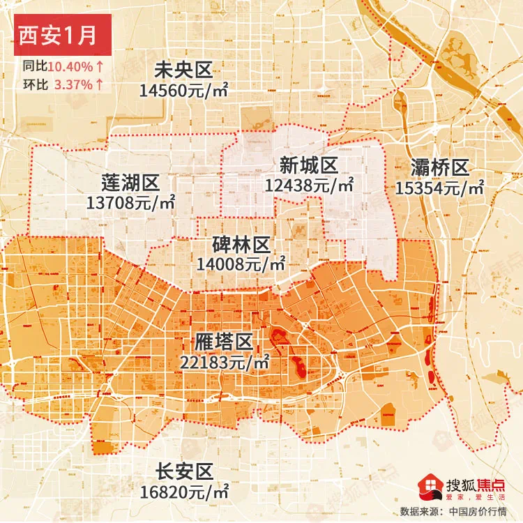 西安1月均价为16388元/㎡同比上涨10.40%↑,环比上涨3.37%↑