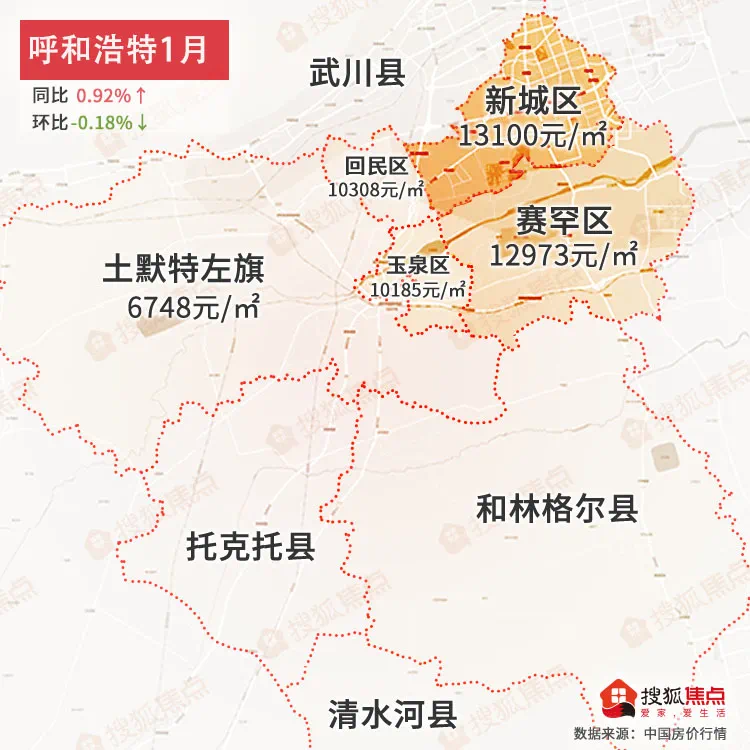 呼和浩特1月均价为11773元/㎡同比上涨0.92%↑,环比下跌-0.18%↓