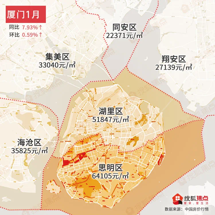 厦门1月均价为50097元/㎡同比上涨7.93%↑,环比上涨0.59%↑