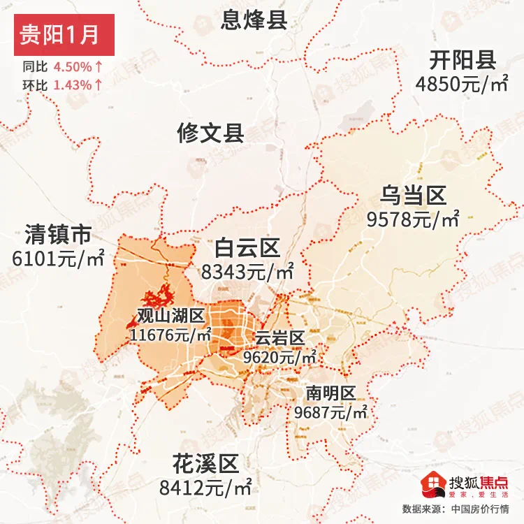 贵阳1月均价为9474元/㎡同比上涨4.50%↑,环比上涨1.43%↑
