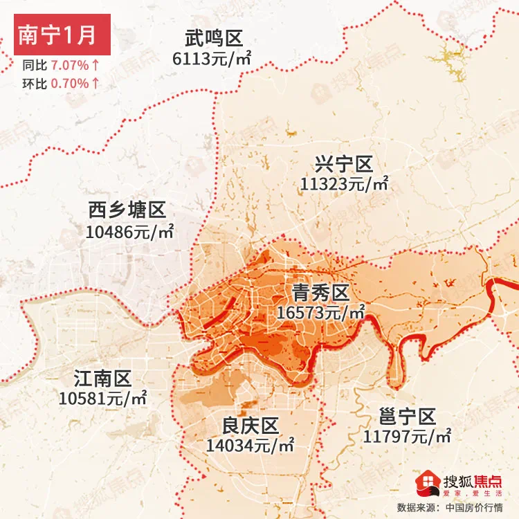 南宁1月均价为13193元/㎡同比上涨7.07%↑,环比上涨0.70%↑