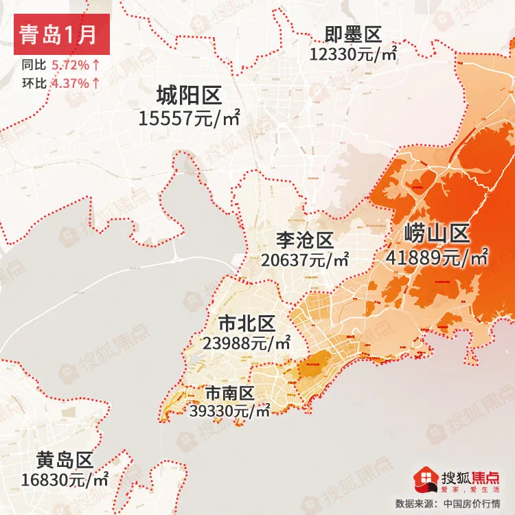 青岛1月均价为22137元/㎡同比上涨5.72%↑,环比上涨4.37%↑