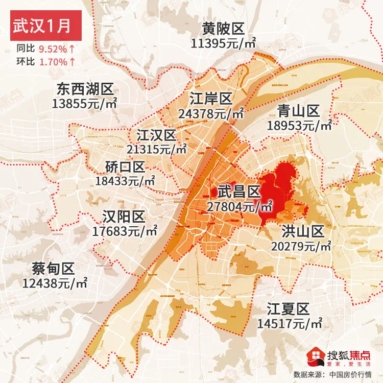 武汉1月均价为19340元/㎡同比上涨9.52%↑,环比上涨1.70%↑