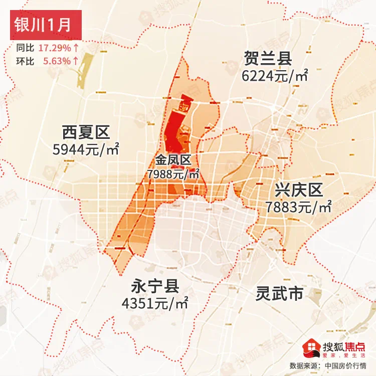 银川1月均价为7481元/㎡同比上涨17.29%↑,环比上涨5.63%↑