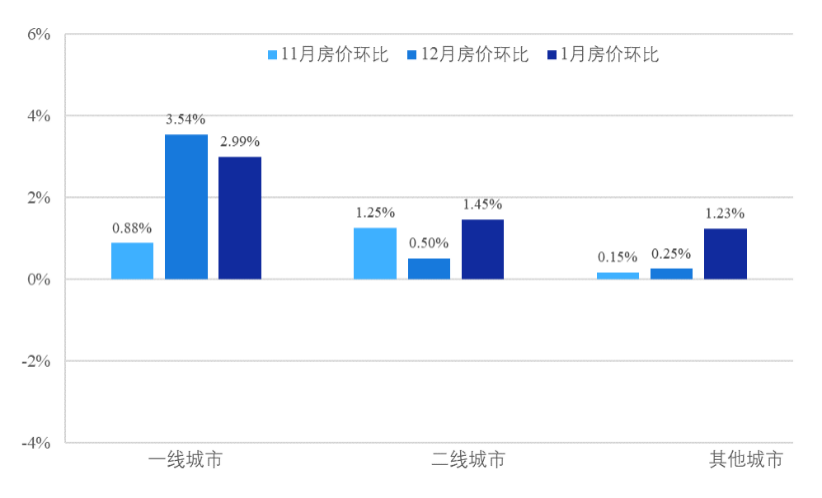从各级城市房价涨跌变化趋势来看,一线城市房价全部上涨,其中上海涨幅较大,二手房价格环比上涨4.83%,北京、深圳、广州涨幅略低,分别为2.74%、2.38%、2.02%。二线城市房价整体微幅上涨,个别城市涨幅较大。其中,佛山环比涨幅超过6%,青岛、南昌环比涨幅超过4%,绍兴、济南、东莞、海口、西安、哈尔滨等城市环比涨幅超过3%;下跌的城市中,石家庄、太原延续12月同环比双跌,其他城市基本稳定。三线城市中,银川、乌鲁木齐涨幅较大,环比涨幅超过5%。