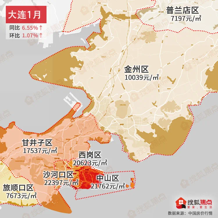大连1月均价为16787元/㎡同比上涨6.55%↑,环比上涨1.07%↑