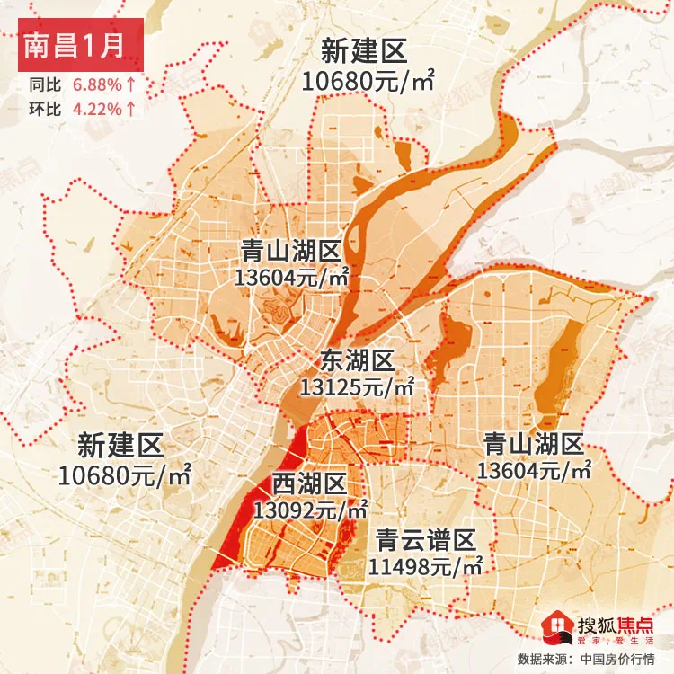 南昌1月均价为13535元/㎡同比上涨6.88%↑,环比上涨4.22%↑