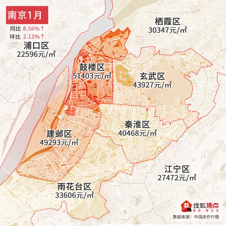 南京1月均价为33556元/㎡同比上涨8.56%↑,环比上涨2.13%↑