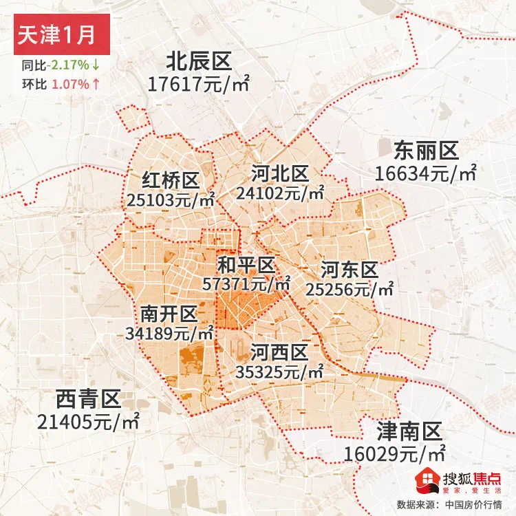 天津1月均价为26613元/㎡同比下跌-2.17%↓,环比上涨1.07%↑