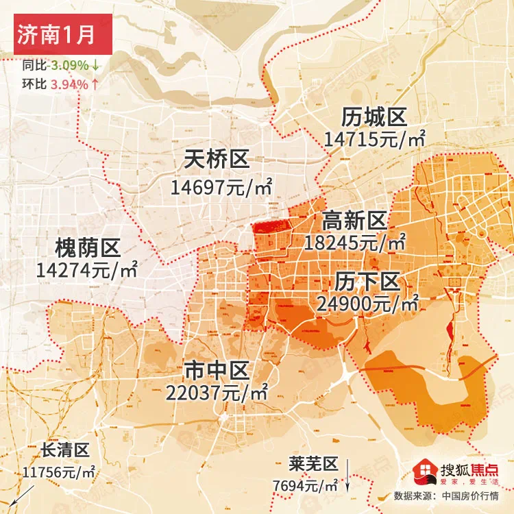 济南1月均价为16012元/㎡同比下跌-3.09%↓,环比上涨3.94%↑