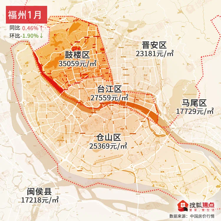 福州1月均价为26588元/㎡同比上涨0.46%↑,环比下跌-1.90%↓