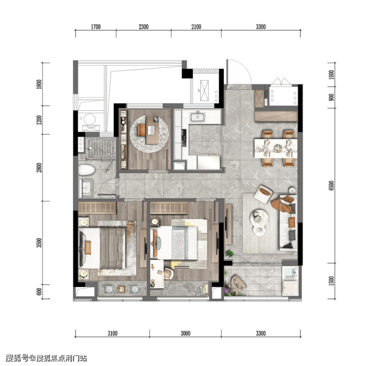 106㎡三房两卫,均为边套。边套最大的感觉就是公区非常阔绰,约6米的边厅自带飘窗,尺度感非常强。