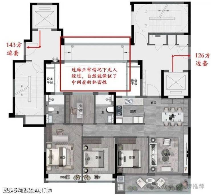 首先这个户型解决了中间套的隐私问题,如上图所示,两个边套回家都不需要经过连廊,所以保证了中间套的私密性。