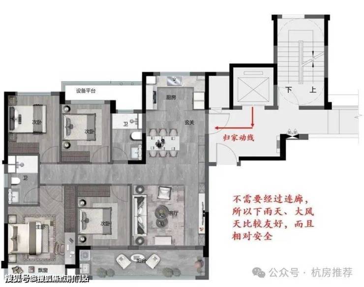 由于电梯的分开设置,连廊设置于中间,所以边套回家的时候不用经过连廊(见下图)。那么下雨天、大风天的时候就比较友好,也相对安全。