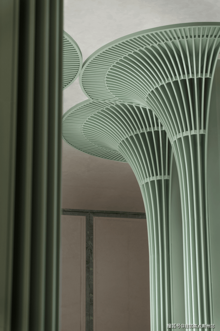会所室内空间由CCD创始人郑忠先生主笔,参考艾迪逊酒店设计,打造出一副星河玉翠之境。3000㎡地下会所,融合了良渚玉琮纹样与现代材质,天珺为其取名:玉石枫林会所。