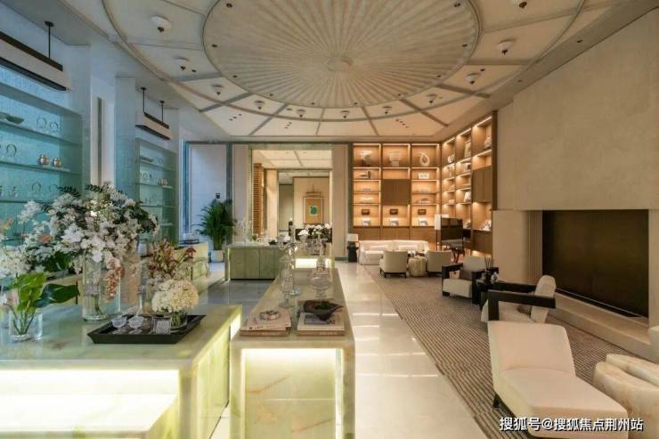 以杭州折扇为灵感而造的约56米超尺度门庭,形制舒展,寓意“藏风聚气”。12片巴西进口百达翡绿玉石屏风,温润围合。