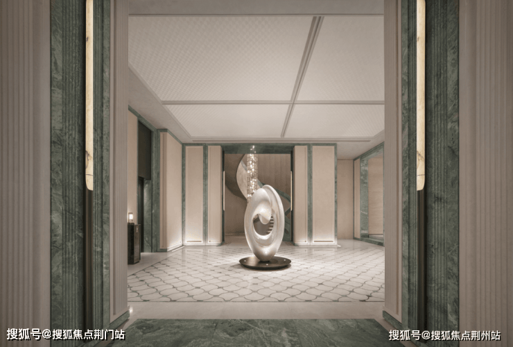 “玉镜流光”雕塑,大堂内八根巨幅立柱,还原了扇骨的形态,汝窑冰裂纹的陶片镶嵌,地面拼花运用江南花窗元素,共同铸就了杭州世家恢弘门仪。