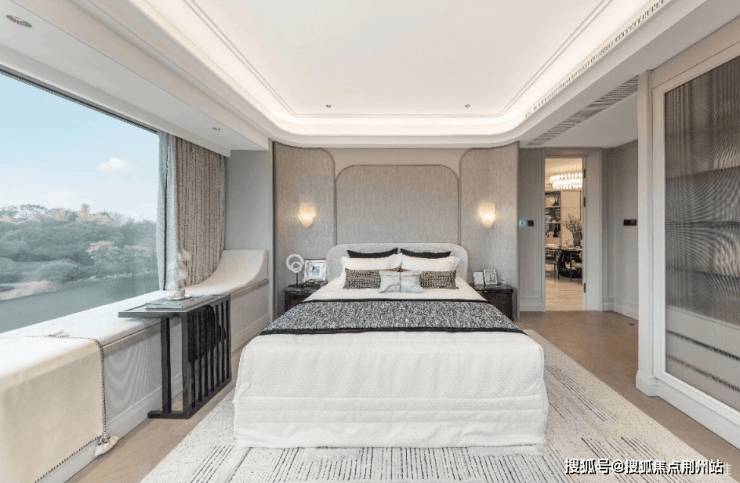 主卧270度转角飘窗,L型全景采光面,不仅将南向园林与北侧城市光影尽收眼底,更创造了一个沉浸式的观景休憩角落。与之匹配的L型衣帽间,实现了衣物、配饰与箱包的系统化收纳。同时还预留保姆家政间,客厅阳台封闭后仍保留多阳台&设备平台,兼顾观景与实用晾晒。