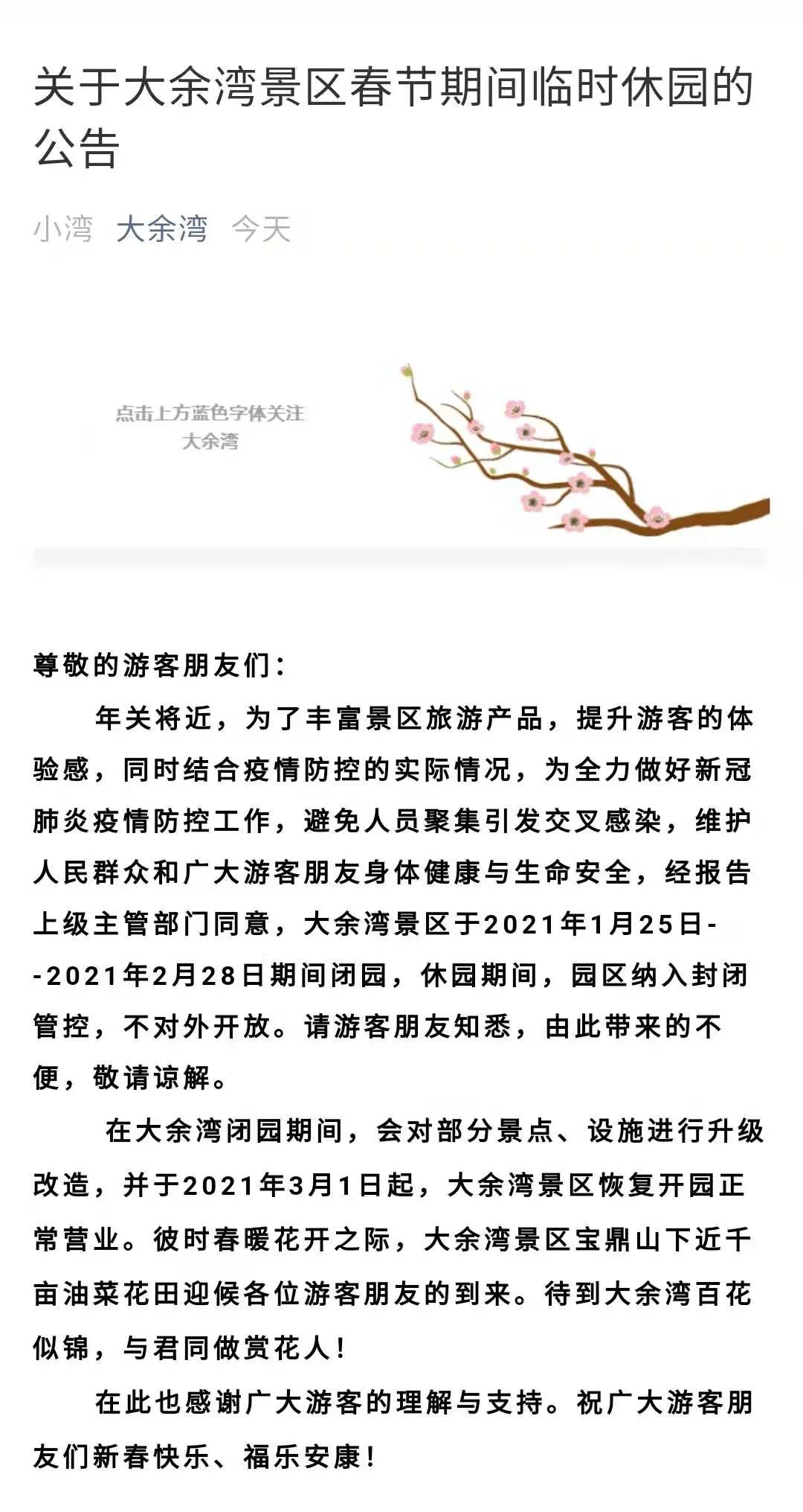 大余湾景区将于2021年1月25日~2021年2月28日期间闭园,休园期间,园区纳入封闭管控,不对外开放。在大余湾闭园期间,会对部分景点、设施进行升级改造,并于2021年3月1日起,恢复开园正常营业。请游客朋友知悉,由此带来的不便,敬请谅解。