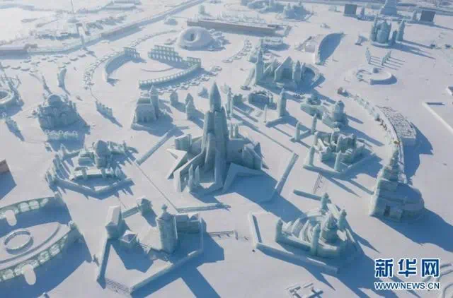 1月22日拍摄的哈尔滨冰雪大世界园区一角(无人机照片)。来源:新华社 谢剑飞 摄