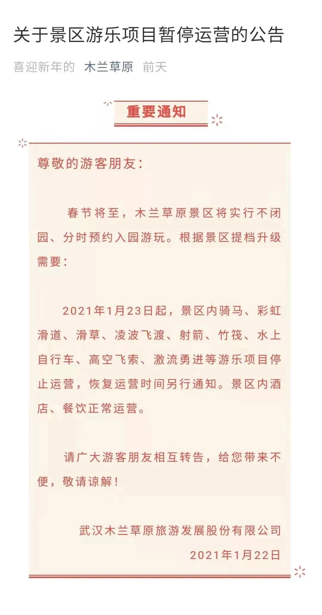 2021年1月23日起,景区内骑马、彩虹滑道、滑草、凌波飞渡、射箭、竹筏、水上自行车、高空飞索、激流勇进等游乐项目停止运营,恢复运营时间另行通知。景区内酒店、餐饮正常运营。请广大游客朋友相互转告,给您带来不便,敬请谅解!
