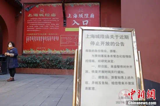 1月24日,上海城隍庙道观发布公告称,为进一步做好新冠疫情防控工作,保障广大信众群众的身体健康和生命安全,1月24日起,上海城隍庙暂停对外开放,恢复开放时间另行通知。
