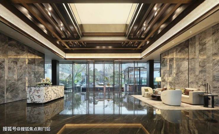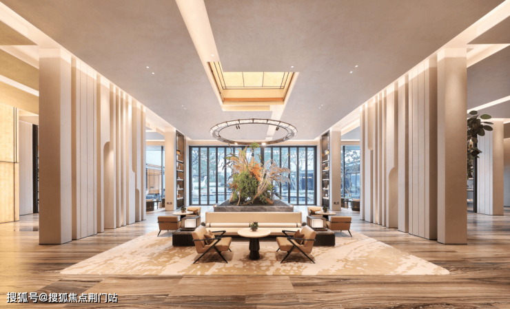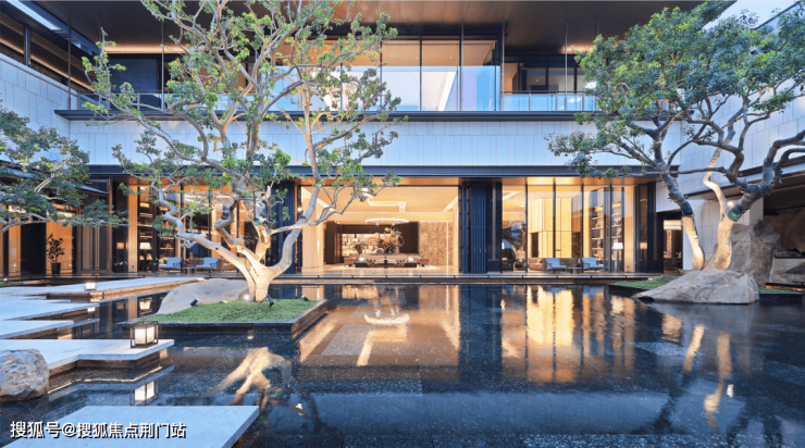 主入口的中式门庭,用扁平檐口设计,恢弘却并没有盛气凌人。镜面水景增加了几分灵动,用罗汉松的苍劲、紫薇的温柔、太行金景石的厚重,组成一幅仪式感满满的迎宾图。