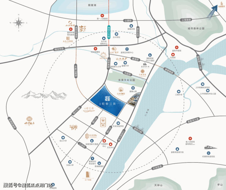 直线约400米的东吴文化公园,是三国文化的传承,也是一座占地约300亩的恢弘园林;直线约500米的富春山馆,来自普利兹克奖得住王澍设计,是建筑版的《富春山居图》,也是文艺范儿的新地标;一路之隔,约20万方的商业旗舰鹿山时代,购物、聚餐、看电影,一网打尽。