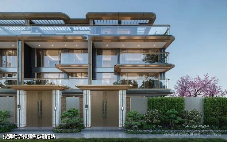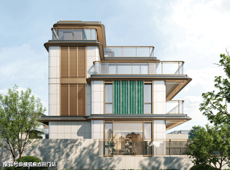 不是传统的新中式,而是采用了更加现代化的表达,大面的落地玻璃搭配金色铝板石材,质感更加轻盈,曲面玻璃+维多利亚奢石点缀,在当下的排屋市场很少有,更符合高端人群的审美。