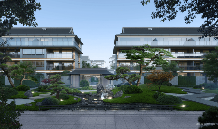 园林设计灵感来源于临平山上塘河,引山水入园,演绎宋式精工居所,整体遵循宋代江南水乡的古城肌理,展现大宅的隐奢调性,营造出“居山水、观天地”的空间意境。三进二庭五园的山水轴布局,两轴九景四时的极致意境生活。