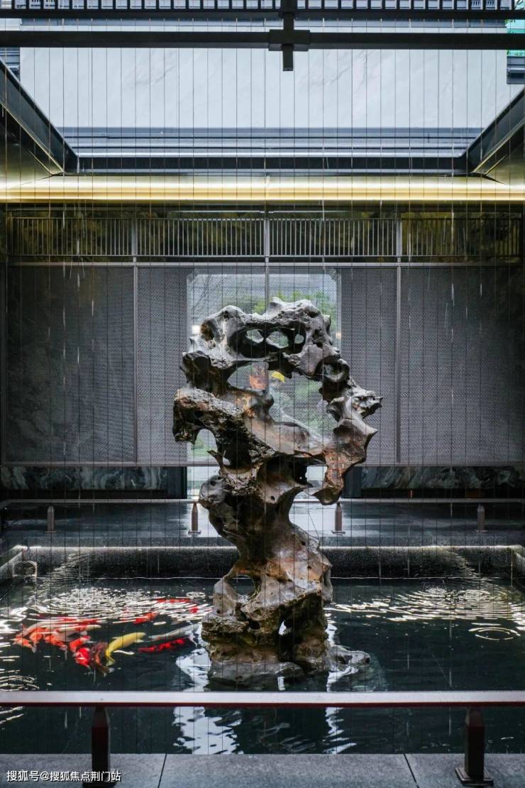 锦鲤池中立着一块虎牙桀立的太湖石——和很多园林后期拼接的“医美太湖石”不同,久映颂月府用了近100吨原生太湖石,叠石匠人全是从业50年以上的大师。