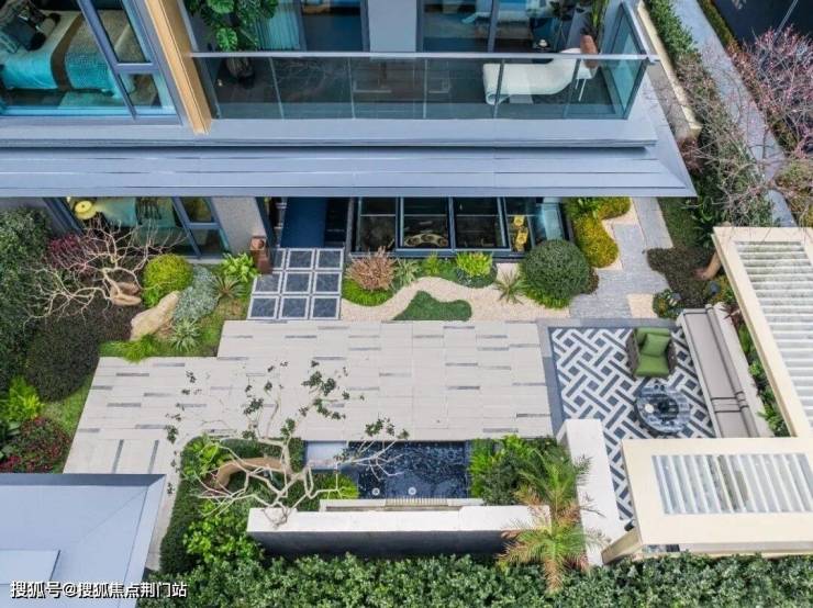 建筑立面采用独特的现代宋风设计,「丹青绝色」铝板、金属格栅、蓝色陶片等材料融合在一起,颜值出众!在景观打造上,项目撷取郭庄园林的精髓,构建“诗意江南”园林景观。