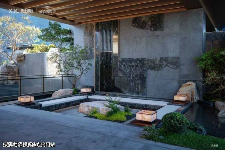 一般的大门都是直接连着入户大堂,但这里居然嵌入了一个方方正正的下沉式卡座,背后是流水潺潺,眼前有亭台游廊。
