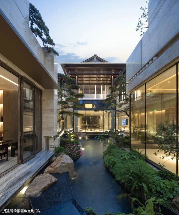 天目飞虹桥两侧的"枕流听涛""云瀑流沙"景观,门厅顶部的榫卯斗拱藻井,下沉庭院内近200年树龄的全灌移植安康松,细节处处彰显文化匠心。
