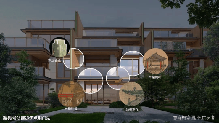将故宫博物院收藏的《四季山水图》避风䈋装饰构件提炼出来,镶嵌在立面上,完美展示古典张力和现代艺术气质。