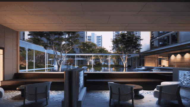 门前是同价位楼盘很少见的日本黑松,树龄有几十年。穿过主入口,迎接你的是美术馆般的巨幅玻璃框景。