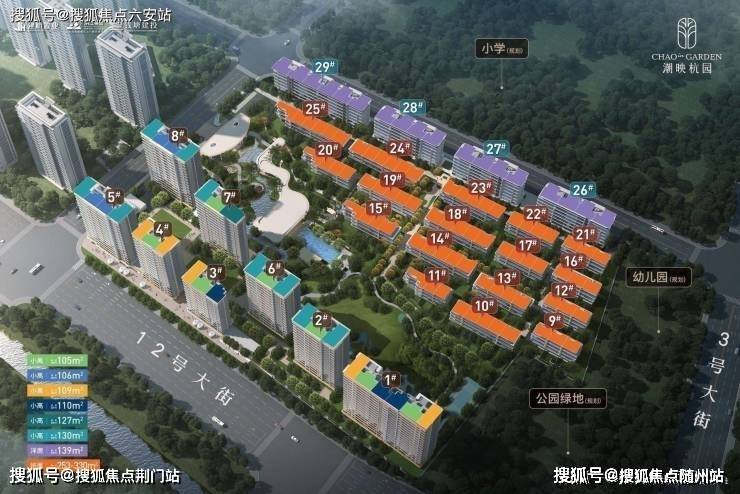 墅区小高层建筑面积约105-130㎡,为最大化景观面,突破性设计建筑面积约105㎡南向四开间。