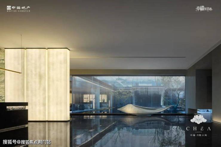 这座水庭也是一整面「水镜」,将中心的乌桕树、周围的超大白玻、精致的艺术雕塑都倒映其中。