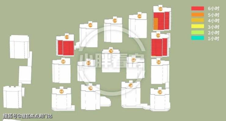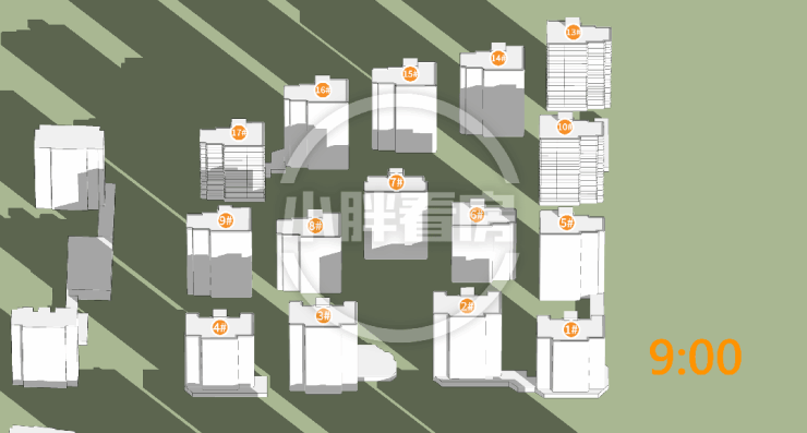 17号楼采光优异几乎不存在遮挡,10号楼低层受遮挡,13号楼中低层受遮挡。就具体遮挡时间而言,10号楼主要在傍晚受7号楼遮挡,13号楼主要在下午受14号楼遮挡。