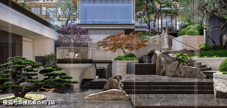 雲润宸庐从这幅古画中汲取灵感,打造了近9米高差的下沉庭院。瀑布从石壁倾泻而下,雾气氤氲、树影摇曳……仿佛不是走在下沉式会所庭院,而是步入了一幅立体山水画。