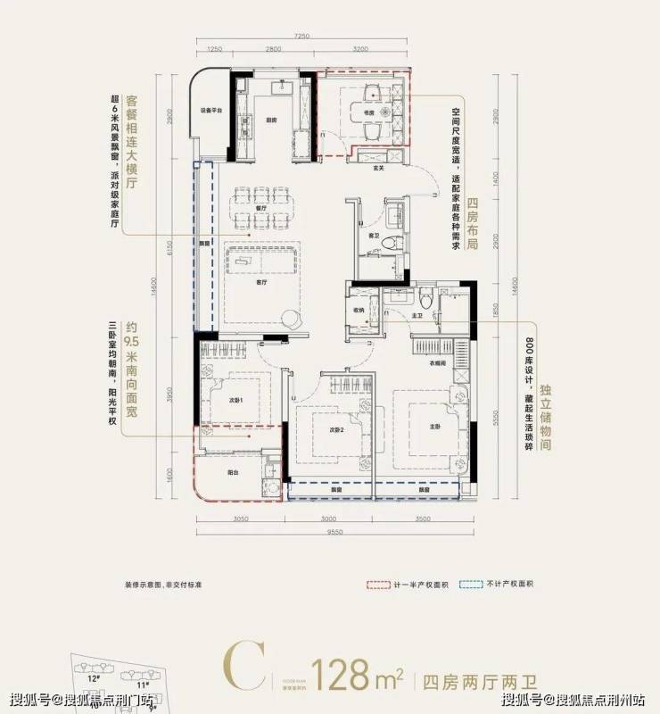 ❷高层建筑面积约128㎡户型,4房2厅2卫,含赠送得房率约93%。