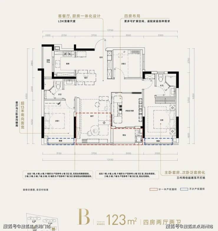 ❸高层建筑面积约123㎡户型,4房2厅2卫,含赠送得房率约90%。