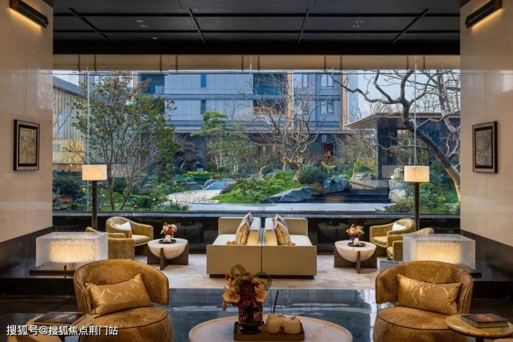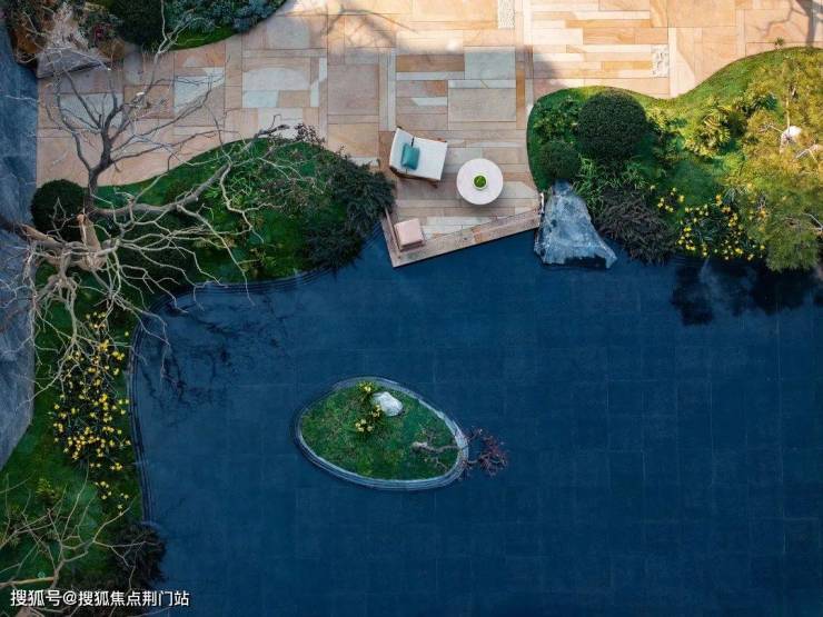 你看,在前场,项目用宝格丽绿奢石打造成一座山丘,再种上铁冬青,叠加潺潺流水,好一幅的微缩山水画卷,不仅寓意富贵满堂,洪福绵延,同时,将江南意境向城市开放。