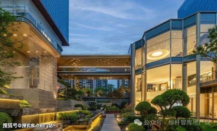 整体的抬高,让约70米宽的鎏金天幕大门头高度达到了约9米,显得格外气势非凡。天桥连接了会客厅、架空层和内部园林。