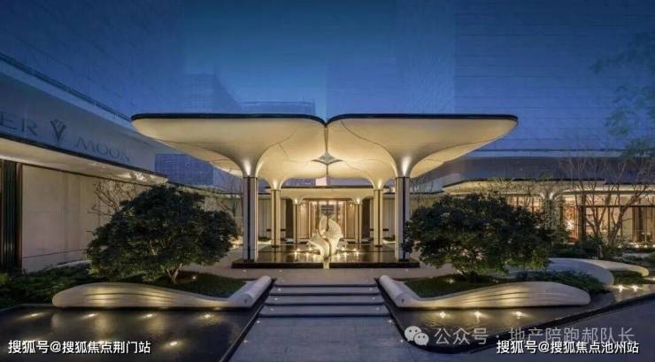 玉树门庭,传承芝澜月华的优雅入口,墙面采用贝金米黄石材,高达7米的玉树构架以UHPC材质精心打造,柱身巧妙嵌入蓝翡翠玉石与亚马逊绿奢石,尽显奢华与精致。